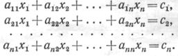 Чтобы эта система имела единственное решение, входящие в нее п уравнений должны быть линейно независимыми. Необходимым и достаточным условием этого является условие неравенства нулю определителя данной системы. Алгоритмы решения задач такого типа подразделяются на прямые и итерационные. Наиболее распространенные прямые методы основаны на приведении системы уравнений к «треугольному» виду. При этом одно из уравнений содержит только одну неизвестную, а в каждом следующем добавляется еще по одной неизвестной. При счете вручную приведение к треугольному виду достигается сложением и вычитанием уравнений после умножения их на соответствующие постоянные множители. Выполняя эту процедуру вручную, нетрудно ошибиться, однако она позволяет построить удобный алгоритм численного решения на ЭВМ. Одним из используемых для этого методов является метод Гаусса. Применяя его, сначала нормируют первое уравнение, деля его коэффициенты на а11. Затем первое уравнение умножают на первые коэффициенты ai,1 всех других уравнений и последовательно вычитают из остальных уравнений. В результате первая переменная будет исключена из всех уравнений, кроме первого. На следующем этапе решения такая же процедура применяется к остальным п– 1 уравнениям. В результате из оставшихся п– 2 уравнений исключается вторая неизвестная. Всю процедуру повторяют до тех пор, пока после п шагов вся система не будет приведена к треугольному виду. Математически эту процедуру можно описать следующим образом. На k-м шаге процесса исключения новые нормированные коэффициенты k-ro уравнения имеют вид