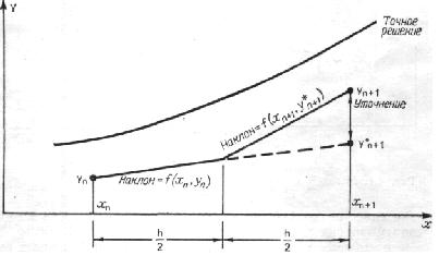 которое используется для вычисления приближенного значения производной в конце интервала f(xn+1, у*п+1). Вычислив среднее между этим значением производной и ее значением в начале интервала, найдем более точное значение уп+1: