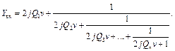 Тут W = f / f н - нормована частота; Порівнюючи вирази (1.69) та (1.70), можна твердити, що вхідні провідності ФНЧ та СПФ однакові, якщо 2 Qkv = Wa k; k = 1, …, n; a n +1 = 1. У цьому випадку однакові коефіцієнти відбиття й частотні характеристики ослаблення фільтрів. Цей факт дає можливість використовувати для визначення добротностей ланок смугового фільтра НВЧ значення табульованих нормованих параметрів a k ФНЧ-прототипу, які наведено в довідниках. Наприклад, у [25] наведено програми розрахунку фільтрів із МПЧХ, ЧЧХ (ідеальних та з втратами), а також Кауера – Золотарьова (ідеальних) за допомогою популярної математичної системи MAPLE V для персональних комп’ютерів. Зазвичай параметри ФНЧ-прототипу нормують так, що на межі смуги пропускання W0 (беруть W0 = 1) значення провідностей і опорів дорівнюють a k. Для заданої смуги пропускання СПФ значення Qk вибирають так, щоб 2 Qkv п = a k, звідки Qk = a k /(2 v п). При цьому ЧХ ослаблення смугових фільтрів НВЧ у функції розстройки v збігається з частотною характеристикою ФНЧ-прототипу у функції W в межах 1...W0 (із точністю до дзеркального відображення на від’ємну піввісь).
