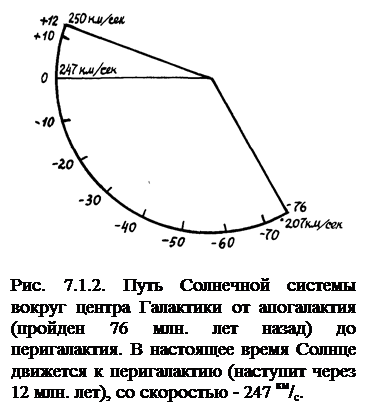 Галактика – колоссальная звездная система. В ней существует поток космических лучей, направленных из густо заселенного звездами центра к краям вдоль магнитных силовых линий в открытый космос. На этом пути поток галактических космических лучей, следуя магнитным силовым линиям Галактики неизбежно проходит через Солнечную систему и возвращается обратно, при этом частично передавая другим галактикам свою энергию в открытом космосе. По данным известного российского астронома П.П. Паренаго, галактический год длится 212 млн. лет, однако геологов больше интересует другой период – 176 миллионов лет. Дело в том, что орбита Солнца (эллиптическая, с перигалактием – моментом наибольшего сближения Солнца с центром Галактики и апогалактием – моментом максимального удаления) оказалась весьма непростой. Сама плоскость этой орбиты как бы вращается навстречу движению Солнца. Из-за этого, покинув перигалактий, Солнце придет в него снова не через полный галактический год, а раньше – через 176 млн. лет (рис. 7.1.2). Итак, раз в 176 миллионов лет Солнце вместе со всей своей планетной семьей приближается к центру Галактики, проходит через пространство, более насыщенное звездами, межзвездной материей, магнитными полями, космическими лучами. Таким образом, Солнце подвергается волновым импульсам воздействия галактической плазмы, исходящей из галактического ядра, и вращающихся газово-пылевых облаков межзвездной материи. Это регулирует солнечную активность, и, соответственно, проявляется в виде геомагнитных возмущений, в геофизических, гидродинамических и биофизических процессах атмосферы над северным и южным полушариями и изменениях климата в целом.