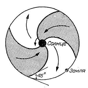 Рис. 7.1.3. Секторная структура межпланетного магнитного поля (ММП). Выделено 4 сектора с различным направлением ММП, показанным стрелками. Маленькой стрелкой показано направление вращения Солнца.