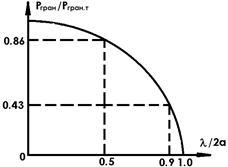 У процесі проектування хвилевідного тракту звичайно необхідно обґрунтовано обирати тип передавальної лінії чи зробити її розрахунок, тобто визначити розміри поперечного перетину хвилеводу, граничну та робочу потужності, загасання та інші характеристики. Головною задачею розрахунку хвилеводу є визначення розмірів поперечного перетину, так як вони визначають усі інші параметри хвилеводу. При цьому необхідно виконати ряд вимог. Головною з яких є необхідність передачі енергії хвилі що біжить лише одного типу. Застосування декілька типів хвиль недоцільно по ряду розумінь. По-перше, сигнали, які передаються хвилями різноманітних типів, переносились би з різними груповими швидкостями, що призвело б до перекручування сумарного сигналу, за рахунок фазових зсувів у точці прийому. Кожен тип хвилі має визначену структуру поля, тому застосування декілька типів хвиль призвело б до ускладнення приладів вводу та виводу енергії, пристроїв що погодять та інших елементів НВЧ. Інтерференція полів декількох типів хвиль призведе до нерівномірного розподілу амплітуд результуючого поля уздовж хвилеводу навіть у режимі хвиль що біжать, отже, збільшується імовірність пробоїв діелектрика. Найпростіше, передача енергії одним типом хвилі забезпечується в одно хвильовому режимі, коли може розповсюджуватися лише основна хвиля, а всі вищі хвилі автоматично усуваються. При цьому розміри поперечного перетину хвилеводу мінімальні. У прямокутному хвилеводі ця умова виконується в діапазоні а =< l < 2а. Однак практично увесь діапазон не реалізується, так як при зростанні довжини хвилі гранична потужність різко зменшується, а загасання зростає (рис. 1.3). Звичайно приймають, що у робочому діапазоні хвилеводу гранична потужність не повинна зменшуватися біль ніж у два рази. Тому умові задовольняє
