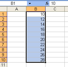 1. Открыть приложение Windows Microsoft Exel. 2. Подвести курсор к ячейке на пересечении столбца B и строки 1, нажать на левую кнопку мыши (активировать ввод данных). В данный момент можно вводить данные в ячейку. Записываем туда число 10. 3. Далее, не снимая выделения с ячейки и нажав на клавиатуре кнопку «shift», выделяем с помощью нажатия на стрелку «вниз» еще 9 ячеек.