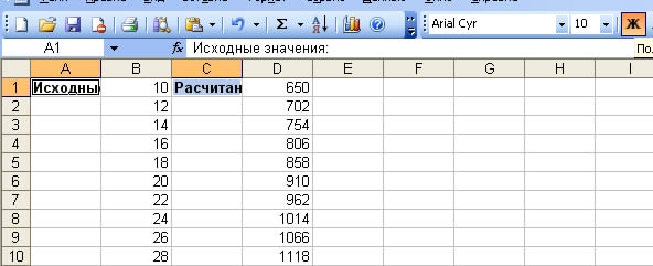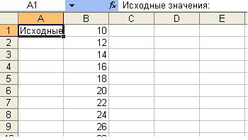6. Рядом с получившейся таблицей выделим ячейку A1. Запишем в нее «Исходные значения:».