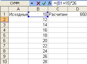 7. По аналогии с пунктом 6 записать в ячейку С1 «Рассчитанные значения:». Затем в ячейки столбца D, начиная с 1ой строки, записать формулу (Вi+15)*26, где i – номер соответствующей строки.