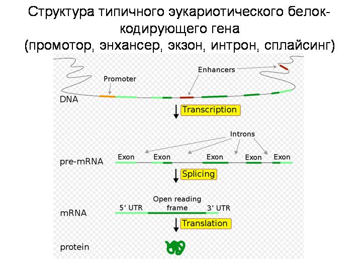 Промотор. Последовательность нуклеотидов перед кодирующей частью гена. К ней прикрепляется РНК-полимераза. В промоторе находятся также сайты связывания некоторых ключевых транскрипционных факторов (ТФ), т.е. регуляторов транскрипции. Без промотора ген не будет транскрибироваться («считываться», «работать», «экспрессироваться»). Энхансер. Регуляторная последовательность нуклеотидов где-нибудь в окрестностях гена (или в интроне). Служит для прикрепления дополнительных ТФ – регуляторов транскрипции.