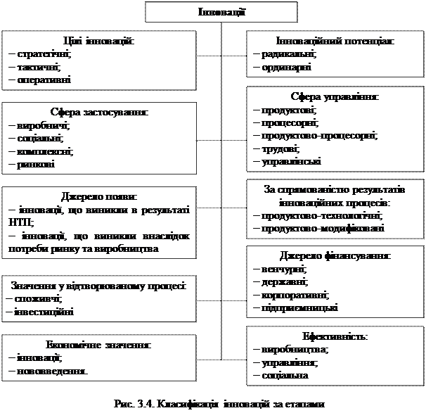 На стадії прикладних досліджень та розробок інновацією є нове технічне вирішення, а на стадії дослідного виробництва – дослідний зразок чи експериментальна партія виробу. Потім здійснюють маркетингові дослідження і на стадії комерційного виробництва новинку можна вважати нововведенням. Проте на будь-якому етапі інновація може бути товаром в умовах поділу праці між економічно самостійними суб’єктами. Ринковий етап охоплює Отже, інновації пов’язують різні за характером і методами управління сфери господарської діяльності: науку, виробництво, інвестиції, збут продукції. Крім того, вони визначають сутність та специфіку інноваційних процесів і відповідно особливості управління ними. У процесі створення організаційно-економічного механізму управління необхідний облік кількості та особи-востей нововведень, які утворюють ці процеси. Через це класифікація інновацій є важливим етапом їх аналізу. Необхідність систематизації зумовлює комплексний характер інновацій, їх багатогранність, різноманітність сфер і методів використання.