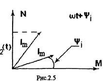 2.3. Изображение синусоидальных величин с помощью вращающихся векторов. Метод комплексных амплитуд. При анализе цепей необходимо выполнять операции над гармоническими функциями по правилам тригонометрии, что вызывает затруднения, поэтому сначала было предложено изображать гармонические функции в виде проекции вращающегося вектора на ось абсцисс или ординат, а затем использовать метод комплексных амплитуд. Покажем, что гармоническую функцию можно определить в виде проекции вращающегося вектора. Возьмем оси М, N прямоугольной системы координат и в момент времени t=0 изобразим вектор, равный амплитудному значению Im и образующий угол (gcb)I с осью М. Пусть данный вектор вращается против часовой стрелки с угловой скоростью (омега). Тогда в момент времени t он займет положение под углом ((омега)t +(пси)I).