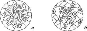 Рис. 8. Разновидности специфических структур: а – оолитовая; б – сферолитовая Сферолитовая структура характеризуется наличием сферолитовых агрегатов минералов сцементированных между собой. Сферолиты могут быть сложены сидеритом, кальцитом, халцедоном, гипсом и другими минералами (рис. 8, б).