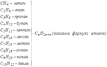 Сполуки, що складаються з Карбону і Гідрогену, в яких усі валентності атомів Карбону, що вільні після утворення зв'язків С - С, насичені атомами Н, називаються насиченими вуглеводнями. Алкани, насичені вуглеводні (рос. алканы; англ. alkanes; нім. Alkane), насичені ациклічні вуглеводні, що мають загальну формулу CnH2n+2, їх також називають парафінами. Більшість їх хімічних реакцій з різними реагентами починається з розриву зв'язку С-Н, тоді як їх розпад при високих температурах йде передовсім по зв'язках С-С. Алкани складають значну частину вуглеводнів нафт і природних горючих газів. Із нафти і горючих газів виділено всі алкани нормальної будови, від метану до тритриаконтану (С33Н68) включно. Оскільки алкани містять максимально можливу кількість водню в молекулі, то вони характеризуються найбільшою масовою теплотою згоряння (енергоємністю), а з ростом кількості атомів масова теплота згоряння алканів зменшується (в метану 50207 кДж/кг). Внаслідок низької густини об'ємна теплота згоряння алканів менша, ніж вуглеводнів іншої будови з такою ж кількістю вуглецевих атомів у молекулі. За агрегатним складом алкани діляться на газоподібні (С1-С4), рідкі (С5-С15) і тверді (починаючи з С16), що кристалізуються при 200oС. 4.3.2 Алкени