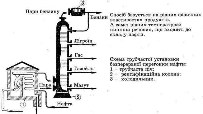 На виробництві перегонка здійснюється у ректифікаційній колоні. При перегонці нафти ніяких хімічних змін із продуктами не відбувається.