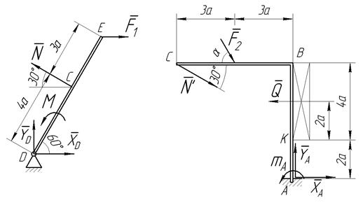 Пример С4а Задание. На угольник ABC (угол ABC=90°), конец A которого жестко заделан, в точке C опирается стержень DE (рис. 5.10). Стержень имеет в точке D неподвижную шарнирную опору и к нему приложена сила F1 и пара с моментом M, а к угольнику – равномерно распределенная на участке KB нагрузка интенсивностью q и сила F2. Дано: F1=10кН, F2=20кН, M=5кНм, q=20кН/м, a=0,2м. Определить: реакции в точках A, C, D, вызванные заданными нагрузками.