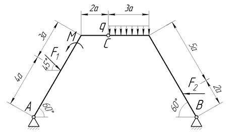 Пример С4б Задание. Конструкция состоит из двух ломаных стержней и представляет собой трехшарнирную арку (рис. 5.12). В точках А и В находятся шарнирные неподвижные опоры, в точке С – шарнир. На левый стержень действует сила F1 и пара с моментом М, а на правый равномерно распределенная нагрузка интенсивностью q и горизонтальная сила F2. Дано: F1=15кН, F2=10кН, M=6кНм, q=30кН/м, a=0,3м. Определить: реакции в точках A, B, C вызванные заданными нагрузками.
