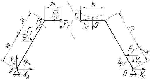 Рисунок 5.12 Конструкция состоит из двух стержней, т.е. можно составить шесть уравнений равновесия, по три для каждого стержня. В опорах А и В по две неизвестных составляющих реакций опор. В точке С шарнир, в котором возникают две пары взаимноуравновешенных сил. Силы XC и YC выражают действие левого стержня на правый, а X’C и Y’C наоборот, действие правого на левый (рис. 5.13). Задача является статически определимой, так как количество неизвестных соответствует количеству уравнений равновесия. Для решения задачи разделим конструкцию на части, приложим соответствующие реакции связей и заменим распределенную нагрузку на эквивалентную сосредоточенную силу Q, приложенную по центру распределения. Модуль силы Q будет равен: