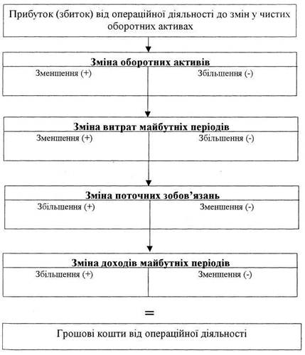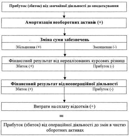 Рис. 2. Алгоритм визначення прибутку (збитку) від операційної діяльності до зміни в чистих оборотних активах хом вирахування з суми грошових коштів від операційної діяльності сплачених відсотків та сплачених податків на прибуток (рис. 4). Етап 5. Визначення чистого руху коштів від операційної діяльності. Для визначення чистого руху коштів від операційної діяльності необхідно врахувати рух коштів внаслідок надзвичайних подій, які не пов'язані з інвестиційною або фінансовою діяльністю (рис. 5). Визначення руху коштів внаслідок інвестиційної діяльності Надходження або видаток коштів від інвестиційної діяльності визначаються на основі аналізу: