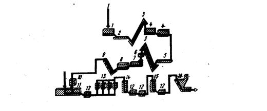 Рис.62. Схема линии производства картофельного пюре. 1, 7 – машины для мойки картофеля; 2, 5 – транспортеры инспекционные; 4 – парово-термические аппараты; 6 – корнерезка; 8 – аппарат варочный; 9 – транспортер шнековый; 10 – экструдер; 11 – смеситель; 12 – насосы винтовые;13 – фильтры; 14, 15 – накопители; 16 – сушилка.