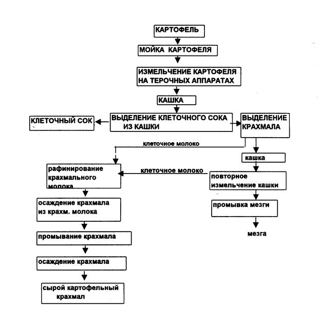 Технологическая схема. Картофельный крахмал широко используется в медицине, пищевой и легкой промышленности. Из крахмала получают глюкозу, клей декстрин, патоку и т.д. Картофельный крахмал получают в два этапа: вначале – сырой крахмал с влажностью 50…52 %, затем сухой – с влажностью 20 %. Технологическая схема производства крахмала представлена на рис. 65 и 66.