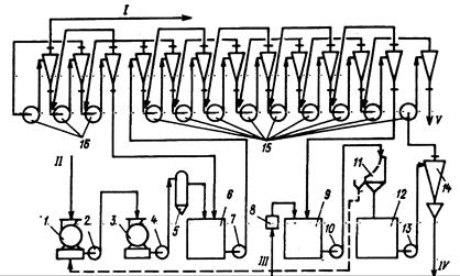 Рис.66. Технологическая схема производства сырого крахмала. 1, 3 – картофелетерки; 2, 4, 7, 10, 11 – насосы; 5 – самоочищающийся фильтр; 6 и 12 – сборники-накопители; 8 – фильтр; 9 – сборник; 11 – рафинировальное сито; 14, 15, 16 – гидроциклоны ГП-100; 1 – мезга + картофельный сок; 11 – картофель; 111 – вода; 1v – песок; V – крахмал. из сборника 6 разбавленную кашку подают на станцию гидроциклонов 15, включающую девять ступеней гидроциклонов для выделения мезги и промывки крахмала; - густой крахмальный сход с предпоследней ступени гидроциклонов направляют в сборник 9, куда через фильтр 8 подают свежую воду для промывки крахмала; - из сборника 9 суспензию насосом 10 направляют на рафинировальноесито 11; - мезгу (надситовый продукт) возвращают на второе измельчение, а суспензию собирают в сборник 12; - из сборника 12 насосом 13 суспензию через песковой гидроциклон 14 подают на последнюю ступень гидроциклонной установки, из которой выходит суспензия крахмала (сырой крахмал), с концентрацией крахмала 37…40 %.