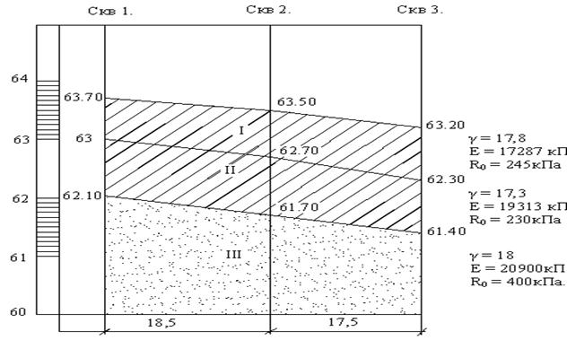 Оценка инженерно-геологических условий площадки строительства Для оценки инженерно-геологических условий площадки строительства обычно выполняют инженерно-геологические изыскания, которые проводят специализированные организации, имеющие лицензии на проведение данного вида работ. В России основной объем изысканий выполняют тресты инженерно-строительных изысканий (ТИСИЗ). Инженерно-геологический разрез представляет собой чертеж, на котором изображены горные выработки (скважины, шурфы), выделены слои грунта, показана их мощность, нанесен ряд показателей их свойств, показан уровень грунтовых вод. В курсовом проекте геологический разрез строится в масштабе Мг = 1: 500 и Мв = 1:100 по трем буровым колонкам, прилагаемым к заданию на проектирование. Анализ физико-механических характеристик грунтов и геологического разреза позволяет: 1. Дать общую инженерно-геологическую оценку площадки строительства (описание рельефа, возможности оползневых смещений, изменение мощности отдельных слоев от скважины к скважине, уровень подземных вод и др.) 2. Дать заключение о возможности использования каждого слоя грунта в качестве естественного основания. 3. Нанести на геологический разрез контуры фундамента здания. 4. Рассмотреть возможные к выполнению варианты фундаментов в конкретных инженерно-геологических условиях. Требуется дать оценку инженерно-геологических условий площадки строительства. На рисунке 8 приведен инженерно-геологический разрез, выполненный по данным трех буровых колонок. Указанное расстояние между буровыми скважинами соответствует их положению на плане размещения геологических выработок. Площадка характеризуется благоприятными условиями для строительства: имеет относительно ровный рельеф, отмечается горизонтальное простирание слоев грунта. В геологическом отношении площадка строительства представлена следующими инженерно-геологическими элементами: В геологическом отношении площадка строительства представлена следующими инженерно-геологическими элементами: 1 – суглинок твердый. γ = 17,8; е = 0,73; Il = -0,1; E = 17287 кПа; R0 = 245кПа; толща 0,8 м. 2 – суглинок полутвердый γ = 17,3; е = 0,79 Il = 0; E = 19313 кПа; R0 = 230кПа; толща 0,9 м. 3 – песок, средней крупности, средней плотности, влажный. γ = 18; е = 0,66; E = 20900кПа; R0 = 400кПа.