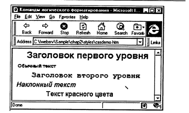 Зовнішній вигляд документа, оформленого з використанням нашого файла таблиці стилів, показаний на мал. 2.16. Неважко помітити, що заголовок першого рівня відображається з відступом від лівого краю, як це і було указано в стилі H1. Заголовок другого рівня зображений з використанням шрифту з фіксованою шириною символів, оскільки у відповідному стилі було вказане сімейство шрифтів Courier. Останні два параграфи документа відображаються відповідно з нахилом і з виділенням червоним кольором. На жаль, навігатор Netscape Navigator проигнорировал створений файл таблиці шрифтів і відобразив документ з використанням стандартного оформлення.