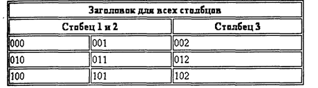 Лістинг 3.6. Файл chap3\tableh4.htm <!"DOCTYPE HTML PUBLIC -//W3C//DTD HTML 3.2//EN"> <HTML> <HEAD> <ТITLE>Та6лицы із заголовком</ТITLE> </HEAD> <BODY BGCOLOR=#FFFFFF> <TABLE BORDER> <TR><TH COLSPAN=3>3aroлoвок для всіх стовпців</ТН></TR> <TR><TH COLSPAN=2>Стовпець 1 і 2</ТН><ТН>Стовпець 3</ТН></TR> <TR><TD>000</TD><TD>001</TD><TD>002</TD></TR> <TR><TD>010</TD><TD>011</TD><TD>012</TD></TR> <TR><TD>100</TD><TD>101</TD><TD>102</TD></TR> </TABLE> </BODY> </HTML>