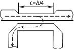 Підбором відстані d та площі петлі S домагаються рівності струмів I м та I е. У цьому випадку через ліве навантаження протікає сумарний струм I м + I е = 2 I е, a через праве струм дорівнює нулю. Через половину періоду струм зміщення в зазначеному перерізі змінює свій напрямок на протилежний, як і струми I м, I е. Магнітне поле, зчеплене з петлею, зростає в напрямку від читача. За правилом Ленца, у рамці наводиться струм, що протікає зліва направо. Отже, через ліве навантаження знову протікає сумарний струм, а через праве струм не протікає. Установивши як ліве навантаження детектор і вимірювальний прилад, можна судити про значення потужності, переданої по основній лінії зліва направо. Якщо хвиля в лінії поширюється справа наліво, то струм у правому навантаженні відмінний від нуля. Установивши також і праворуч детектор з вимірювальним приладом, можна за показаннями двох приладів судити про співвідношення амплітуд, наприклад відбитої хвилі та тієї, що падає, тобто про значення коефіцієнта відбиття (і КСХ). На практиці часто використовують один вимірювальний прилад і детектор, установлені на платформі, яка обертається навколо осі, перпендикулярної до ЛП (рис. 1.129.б). Переключаючи цей вимірювальний пристрій, називаний рефлектометром, по черзі у два положення (змінюватися положення петлі) й відраховуючи показання, пропорційні амплітудам хвилі, що падає, і відбитої, визначають КСХ влінії. Смужковий СВ у разі довжини області зв’язку L = L/4 (рис. 1.130, 1.131) є проти-спрямованим, оскільки, відповідно до закону електромагнітної індукції, на бічній лінії наводяться заряди протилежної полярності, та квадратурним.