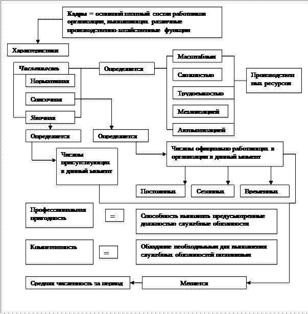 Рис 1.3 Классификация персонала Служащие осуществляют трудовую деятельность с преобладающей долей умственного труда (руководство и специалисты). Принципиальное отличие руководителей от специалистов заключается в юридическом праве принятия решений и наличие в подчинении других работников. Персонал (кадры) обладает определёнными качественными и количественными характеристиками (см рис1.4). Качественные параметры обусловлены требованиями к уровню квалификации работников. Количественные обусловлены объёмом выпускаемой продукции, сложностью продукции, степенью автоматизации и компьютеризации технологических процессов. Обычно персонал формируется целенаправленно, что позволяет оптимизировать его численность, профессиональную и квалификационную структуру, обеспечить рациональное распределение трудовых функций и загрузку работников, их состав с различным функциональным содержанием труда. Конечная цель формирования персонала – создание работоспособного трудового коллектива. Таким образом, численность персонала определяется масштабом, сложностью, трудоёмкостью производственных процессов, степенью их механизации, автоматизации, компьютеризации. Эти факторы задают нормативную (плановую) численность, которую на практике почти никогда не удаётся обеспечить. Поэтому персонал более объективно характеризуется списочной (фактической) численностью. То есть количеством сотрудников, которые официально работают в организации на данный момент. В списочный состав работников на каждый календарный день включаются как фактически работающие, так и отсутствующие по каким-либо причинам. Не включаются совместители, работники для разовых и специальных работ, привлекаемые на основе специальных договоров, направленные на учёбу с отрывом от производства и получающие стипендию за счёт предприятия и некоторые другие. Списочная численность может существенно отличаться от нормативной. Целесообразно постоянно контролировать соотношение этих 2-х показателей в абсолютном и относительном выражении и не допускать их значительного расхождения. Списочная численность на определённую дату включает всех работников, в том числе принятых с данной даты и исключает всех уволенных, начиная с этой даты. В её состав включают 3 категории лиц: