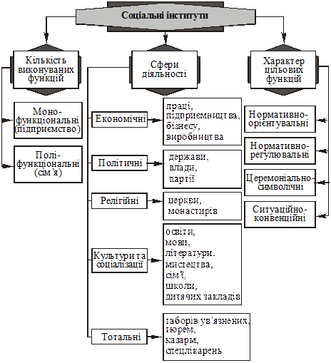 Однією з необхідних умов появи соціальних інститутів виступає відповідна соціальна потреба. Інститути покликані організовувати спільну діяльність людей з метою задоволення тих чи інших соціальних потреб. Соціальний інститут виникає на основі соціальних зв’язків, взаємодії та відносин конкретних осіб, індивідів, соціальних груп та інших спільнот. Соціальні інститути мають надіндивідуальний характер, свою особисту системну якість. Отже, соціальний інститут являє собою самостійне суспільне утворення, яке має свою логіку розвитку. З цієї точки зору соціальні інститути можуть бути розглянуті як організовані соціальні системи, що характеризуються стійкістю структури, інтегрованістю їх елементів і певною мінливістю їх функцій. Кожний соціальний інститут характеризується наявністю мети своєї діяльності, певними функціями, що забезпечують досягнення такої мети набором соціальних позицій і ролей, типових для даного інституту. На основі всього вищезазначеного можна зробити таке визначення: соціальні інститути — це організовані об’єднання людей, що виконують певні соціально вагомі функції та забезпечують спільне досягнення цілей на основі соціальних ролей, що їх виконують члени, які задаються соціальними цінностями, нормами і зразками поведінки. За характером цільових функцій соціальні інститути поділяються на: — нормативно-орієнтувальні, що здійснюють морально-етичну орієнтацію поведінки індивідів, утверджують у суспільстві загальнолюдські цінності, спеціальні кодекси та етику поведінки; — нормативно-регулювальні, що здійснюють регулювання поведінки на основі норм, правил, спеціальних приписів, закріплених у юридичних та адміністративних актах. Гарантом їх виконання є держава, її представницькі органи, зокрема адміністрації установ, підприємств тощо; — церемоніально-символічні та ситуаційно-конвенційні, що визначають правила взаємної поведінки, регламентують способи обміну інформацією, комунікативні форми неофіційної субординації (звернення, привітання, схвалення/несхвалення тощо). Найбільш важливими соціальними інститутами сучасного суспільства є: — економічні, що регулюють соціальні зв’язки в господарській сфері, забезпечують процес виробництва, виконують нормативно-розподільну функцію, розподіляючи та перерозподіляючи матеріальні блага чи їх еквіваленти. Вони формують економічний потенціал суспільства, підтримують стійкість його соціальної структури, розмежовують організації і професійно-статусні групи за способами і якістю споживання, за типами способу життя; — політичні, що регулюють соціальні зв’язки з приводу використання влади, її здійснення та розподілу. Політичні інститути встановлюють і підтримують політичну владу соціальної групи, що домінує в суспільстві, забезпечують відтворення і стійке збереження ідеологічних цінностей; — культури та соціалізації,діяльність яких зв’язана з розвитком і поширенням культури, соціалізацією особистості, засвоєнням нею соціальних цінностей. Соціокультурні інститути засвоюють, а потім відтворюють культурні та соціальні цінності, нагромаджувані в процесі соціальної діяльності, залучають індивідів до певних субкультур, а також регулюють їх соціалізацію через засвоєння стійких соціокультурних стандартів поведінки, захист відповідних