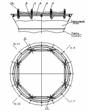 Механические интерфейсы рассмотрим на примере системы разделения КА от РБ. Система разделения предназначена для жесткого крепления КА к разгонному блоку в процессе вывода на рабочую орбиту и отделения его в заданный момент времени по сигналу системы управления, обеспечивая заданные характеристики отделения (линейные и угловые скорости и т.п.). В системах разделения используются следующие виды энергии: -энергия экзотермических химических реакций; -энергия механических устройств; -другие виды энергии (потенциальная энергия гидравлических и пневматических устройств, тепловая, магнитная, электромагнитная энергия). Все большее распространение находят комбинированные системы разделения, использующие несколько видов энергии для выполнения различных функций. Например, в системах разделения может использоваться энергия горения пиротехнических составов и механическая энергия пружинных толкателей. Выбор оптимальных вариантов систем разделения осуществляется на основании их оценки по таким критериям, как надежность функционирования, масса систем разделения, импульс развиваемой силы, габариты, радиационная и термическая стойкость, нечувствительность к динамическим факторам, величина возмущений, накладываемых на движение КА при разделении, а также экономические, технологические, эксплуатационные и др. показатели. Наиболее эффективными в настоящее время являются следующие системы разделения: -пиротехнические системы, состоящие из пороховых аккумуляторов давления, соединенных с замками-толкателями системой трубопроводов; -автономные пиротехнические замки с пиропатронами и пружинные толкатели, или автономные замки-толкатели; -автономные детонационные замки, соединенные трансляторами подачи команды, и пружинные толкатели. Рассмотрим одну из систем, например, систему разделения, состоящую из детонационных замков, объединенных транслятором подачи команд и пружинных толкателей. Данная система по сравнению с пиротехнической системой отделения имеет меньшую массу и габариты, одинаковую надежность, меньшие величины возмущений, накладываемых на КА при разделении. Она также обеспечивает компенсацию продольных и боковых нагрузок при эксплуатации. Конструктивная схема системы разделения представлена на рисунке.