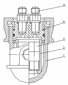 Пороховой аккумулятор давления: 1-корпус; 2-сепаратор; 3-патрон; 4-пирогнездо; 5-пиропатрон. Процесс разделения происходит следующим образом: при поступлении электрического питания на мостики пиропатронов, последние срабатывают и инициируют пиротехнические патроны, которые создают основную массу рабочего газа. Газ через коллектор и трубопроводы поступает на поршни поз. 2 в замках-толкателях (см. рисунок).