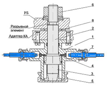 Замок-толкатель: 1-корпус; 2- поршень; 3- шток; 4-шариковый замок; 5-гильза. Поршень под действием газа перемещает шток поз. 3, последний перемещаясь, освобождает шарики поз. 4 и тем самым снимает силовую связь между гильзой поз. 5 и корпусом поз. 1. При дальнейшем движении поршень (на ходе 60 мм) через гильзу поз. 5 сообщает необходимую относительную скорость отделения головному блоку. Детонационный замок. В данной конструкции используется детонационный замок тянущего типа (см. рисунок). Замок состоит из корпуса поз. 1, в котором в кольцевую канавку запрессовано эластичное взрывчатое вещество (ЭВВ) поз. 4, штока с разрывным элементом поз. 2, амортизатора поз. 3, упирающегося в гайку поз. 5. Стык затягивается гайкой поз. 6, между двумя стыковочными шпангоутами расположена специальная рифленая шайба поз. 8. С двух сторон к корпусу подводятся трансляторы детонации поз. 7.