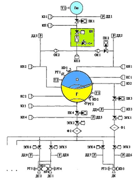 Принципиальная схема ДУ на двухкомпонентном топливе (АТ и НДМГ) Система хранения топлива включает бак сферической формы, выполненный из алюминиевого сплава 01570М и обладающего более высокими значениями механических характеристик (предел прочности и текучести) по сравнению с традиционным материалом АМгб на 25...45 %. Внутри бака установлено триметаллическое днище для разделения полостей окислителя и горючего. Для запуска двигателей в невесомости внутри полостей окислителя и горючего размещаются заборные устройства. Возможно применение ряда почти равноценных по массовым характеристикам вариантов исполнения внутрибаковых заборных устройств: эластичное вытеснительное устройство - мягкая оболочка из пластополимерной многослойной фольгированной пленки, мембранный разделитель – диафрагма (металлическая и полимерная), капиллярное устройство – система фильтрующих и удерживающих топливо сеток и металлический сильфон. Конструкция внутрибаковых устройств (типа эластичного устройства, диафрагмы и капиллярного устройства) прошла апробацию в двигательных установках системы ориентации и стабилизации ряда КА. Выбор окончательного варианта внутрибакового устройства проводится после проработки вопроса о разновыработки топлива из полостей бака и динамики КА с жидким наполнением. На наружных поверхностях топливных полостей сферического бака расположены электронагреватели (НЭ1, НЭ2) и термочувствительные элементы системы термостабилизации (РТ2, РТЗ) компонентов топлива. Система подачи топлива включает серийные пиропатроны с пироклапаними (ПКЗ, ПК4) для предотвращения попадания топлива в коллекторы двигателей коррекции и стабилизации до начала работы ДУ, фильтры (Ф1, Ф2), электрогидроклапаны (ЭГК1, ЭГК2), для управления подачей топлива к управляющим клапанам двигателей, заправочно-проверочные магистрали с клапанами (К32, КЗЗ, КПЗ, КП4) и клапаны слива (КС1.КС2). Контроль давления в магистралях окислителя и горючего проводится с помощью датчиков давления (ДЦ4, ДЦ5, ДД6,...). Основные характеристики двигателя на двухкомпонентном топливе представлены в таблице.