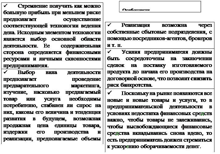 Формула предпринимательства: получение максимальной прибыли при минимальном риске. Однако ее реализация происходит в условиях высокого уровня неопределенности в успехе дела, обусловленной рыночными отношениями и динамичностью изменения спроса и предложения. Отсюда важнейшими чертами предпринимательства являются: риск. мобильность, динамичность предпринимательских действий (не опоздать, вовремя уловить изменяющийся спрос, угадать тенденции и действовать на опережение). Предприниматель не сидит на месте, он непрерывно ищет новое. Чтобы выдержать конкуренцию, он непрерывно совершенствует технологию своего производства, корректирует цену товара, его качество в соответствии с изменениями, происходящими в среде его использования