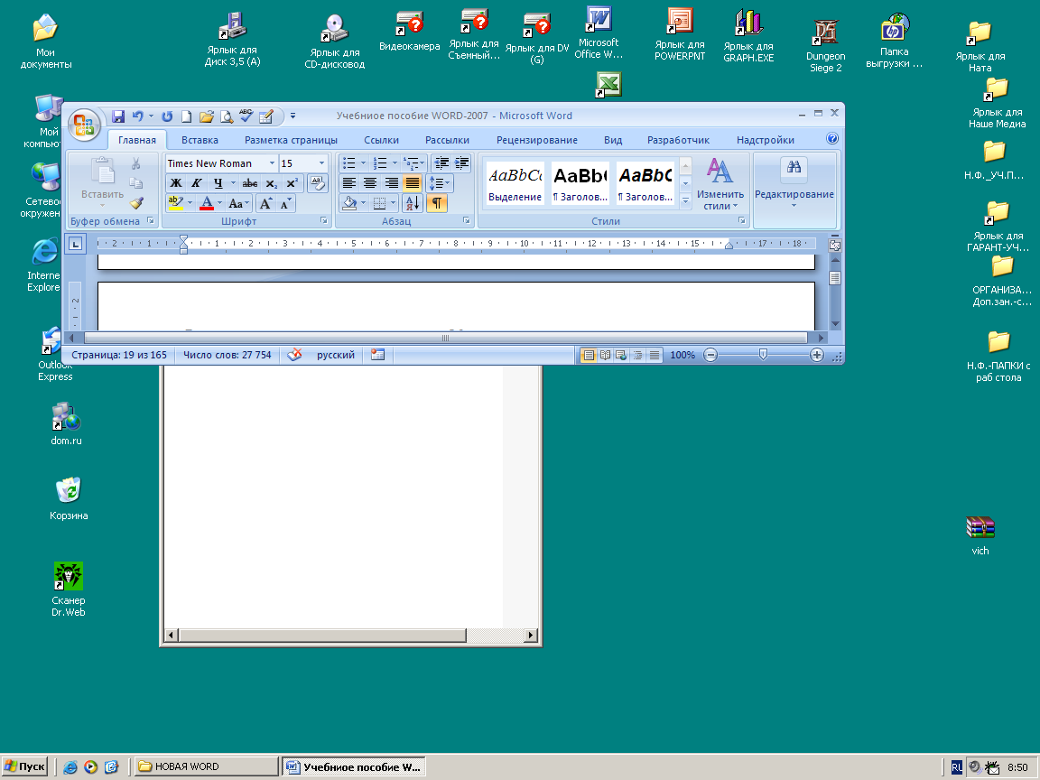 Дополнительные панели, в отличие от диалоговых окон можно отрывать не по одному и держать открытыми сколь угодно долго. Их можно стыковать с рамкой окна или с другими панелями. В этом случае панель превращается в Область задач, известную нам по предыдущим версиям программы Microsoft Word. 1.5. Краткий обзор функций 1.5.1. Вкладка "ГЛАВНАЯ" Основное назначение вкладки ГЛАВНАЯ - работа с текстом: его ввод, редактирование и форматирование. На вкладке представлены следующие группы: Буфер обмена, Шрифт, Абзац, Стили и Редактирование. Буфер обмена. Средства группы Буфер обмена (БО) предназначены для копирования и перемещения объектов или элементов текста. В составе группы кнопки: Вырезать (CTRL +X), Копировать (CTRL + С), Вставить (CTRL + V). Здесь же располагается кнопка Формат по образцу (CTRL + SHIFT + С). Она позволяет копировать оформление текста с одного места на другое. Шрифт. В группе Шрифт сосредоточены средства, предназначенные для ручного (неавтоматического) управления параметрами шрифтового оформления. Действие этих средств распространяется только на выделенный фрагмент текста. Абзац. Средства группы Абзац предназначены для ручного (неавтоматического) управления оформлением абзацев текста. Действие средств управления абзацами распространяется на выделенные абзацы, а если ничего не выделено – на тот абзац, в котором установлен курсор. Примечание. Ручные средства форматирования предназначены для создания небольших документов: кратких записок и простейших писем или для отладочных работ. Во всех остальных случаях отдавайте предпочтение автоматическому форматированию с помощью стилей.