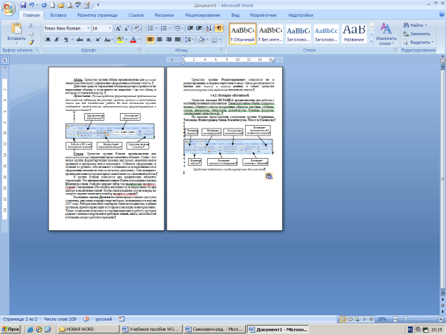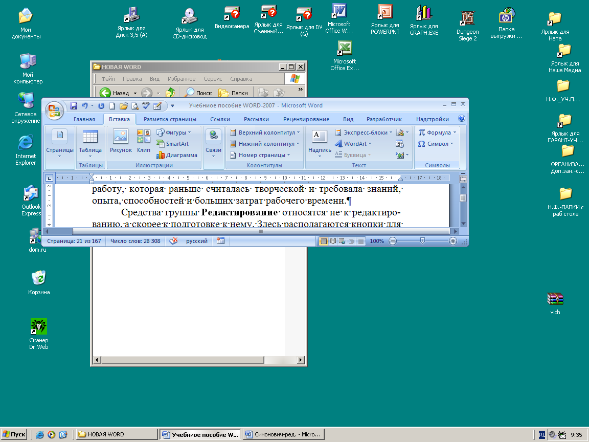 Стили. Средства группы Стили предназначены для автоматического управления представлением абзацев. Стиль - это целая группа форматирующих команд (настроек), имеющая имя и хранимая в программе или в документе. Стилевое оформление, в отличие от ручного, обеспечивает стабильность и гармоничность в оформлении элементов текста по всемудокументу. Оно повышает производительность труда и представительность сделанной работы. К группе Стили относятся два графических элемента управления. Это интерактивная галерея Стили и командная кнопка Изменить стили. Галерея содержит набор так называемых экспресс-стилей. Она призвана обеспечить наглядность и оперативность при выборе и назначении стилей. Чтобы стили входили в состав галереи, их следует заранее включить в набор экспресс-стилей. Командная кнопка Изменить стиль предоставляет доступ к стилевым, цветовым и шрифтовым наборам, появившимся в версии 2007 года. Наборы позволяют подбирать стили не поодиночке, а целыми группами, причем происходит этот процесс наглядно и интерактивно. Такая технология позволяет в секунды выполнять работу, которая раньше считалась творческой и требовала знаний, опыта, способностей и больших затрат рабочего времени. Редактирование. Средства группы Редактирование относятся не к редактированию, а скорее к подготовке к нему. Здесь располагаются кнопки для поиска и замены данных, а также средства автоматизированного выделения элементов текста. 1.5.2. Вкладка "ВСТАВКА" Средства вкладки ВСТАВКА предназначены для работы с комбинированными документами. Такие документы обычно содержат помимо обычного текста встроенные объекты: рисунки, таблицы, схемы, диаграммы, гиперсвязи, колонтитулы, буквицы, формулы, специальные символы и др.. На вкладке представлены следующие группы: Страницы, Таблицы, Иллюстрации, Связи, Колонтитулы, Текст и Символы.