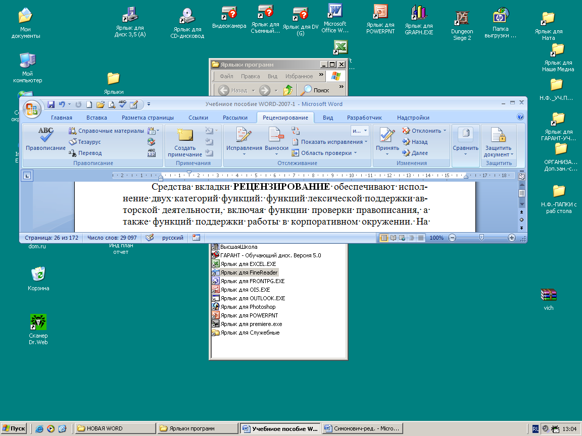 Вкладка "РАССЫЛКИ" Начать слияние. Группа Начать слияние предназначена для выбора, настройки и правки списка получателей массовой рассылки. При отсутствии такого списка его можно создать во внутренней базе данных Word. Составление документа и вставка полей. По умолчанию группа элементов управления Составление документа и вставка полей не активирована. Она активируется после создания основного документа слияния и позволяет вставить в него поля слияния (ссылки к адресной книге) и выполнить их настройку. Просмотр результатов. Назначение группы Просмотр результатов вытекает из ее названия. Панель переходов, имеющаяся в этой группе, позволяет просмотреть созданные индивидуализированные письма и проверить корректность заполнения полей слияния. Завершить. Завершающие операции выполняются средствами группы Завершить. 1.5.6. Вкладка "РЕЦЕНЗИРОВАНИЕ" Средства вкладки РЕЦЕНЗИРОВАНИЕ обеспечивают исполнение двух категорий функций: функций лексической поддержки авторской деятельности, включая функции проверки правописания, а также функций поддержки работы в корпоративном окружении. На этой вкладке располагаются группы Правописание, Примечания, Отслеживания, Изменения, Сравнить и Защитить.