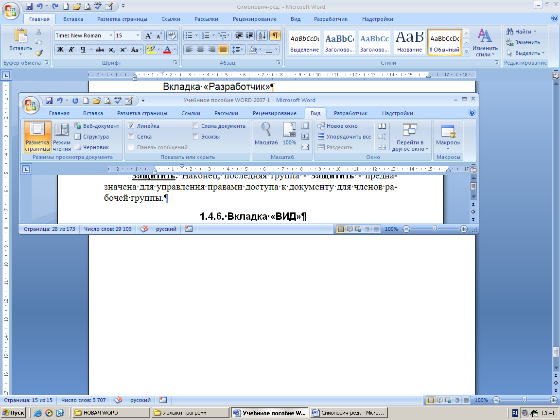 Правописание. Помимо собственно проверки правописания средства группы Правописание предоставляют доступ к лексическому справочнику (тезаурусу) и средствам перевода на иностранные языки (требуют установки соответствующих компонентов). Здесь же расположена кнопка получения статистики (количество слов, знаков, строк и абзацев в документе). Прочие средства вкладки предназначены для обеспечения коллективной работы с документами. Примечания. Кнопки группы Примечания позволяют создавать и просматривать примечания к документу. Отслеживание. Средства группы Отслеживание позволяют вести учет исправлений в документе при его редактировании. Изменения. Внесенную правку можно принять или отклонить, что выполняется с помощью средств группы Изменения. Сравнить. Группа Сравнить представляет средства, позволяющие сопоставить две версии документа, выполненные разными сотрудниками или одним сотрудником, но в разное время, и выявить в них различия, а также объединить два документа в один. Защитить. Наконец, последняя группа - Защитить - предназначена для управления правами доступа к документу для членов рабочей группы. 1.5.7. Вкладка "ВИД" Средства вкладки ВИД предназначены для настройки интерфейса программы. Здесь располагаются группы: Режимы просмотра документов. Показать или скрыть, Масштаб, Окно, Макросы. Режимы просмотра. Средства группы Режимы просмотра предназначены для переключения между режимами отображения документа на экране. Они дублируют элементы управления Панели представлений.
