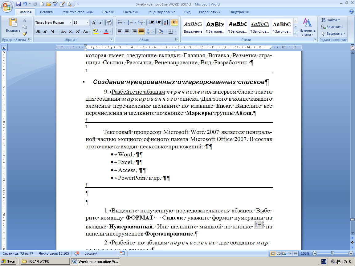 Вместо строки меню и панелей инструментов в Microsoft Word 2007 появился новый элемент управления - Инструментальная лента, которая имеет следующие вкладки: ¶ 1. Главная, ¶ 2. Вставка, ¶ 3. Разметка страницы, ¶ 4. Ссылки, ¶ 5. Рассылки, ¶ 6. Рецензирование, ¶ 7. Вид, ¶ 8. Разработчик. ¶