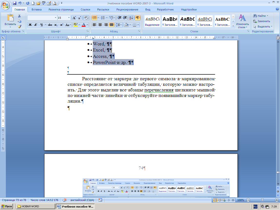 6. Расстояние от маркера до первого символа в маркированном списке определяется величиной табуляции, которую можно настроить. Для этого выделив все абзацы перечисления, щелкните мышкой по нижней части линейки и отбуксируйте появившийся маркер табуляции в нужное место.