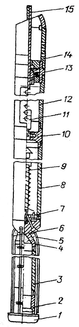 1 – кольцевой нагреватель 2 – кернорвательное устройство 3 – керноприемная труба 4 – нижний монтажный переходник 5 – водоподъемные трубки 6 – трубки с водоподводящими проводами 7 – нагревательные элементы системы обогрева 8 – водосборный бак 9 – центральная водоподъемная трубка 10 – насосный переходник 11 – электронасос 12 – электроотсек 13 – кабельный замок с датчиком веса снаряда 14 – шламовая труба 15 – грузонесущий кабель
