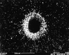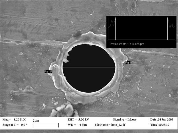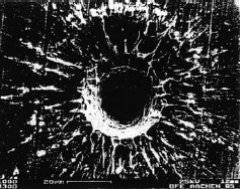 Рис. 9. Образец отверстия в нержавеющей стали на выходе луча в пакетном режиме работы промышленного лазера с активным элементом KULON LT-15CU.