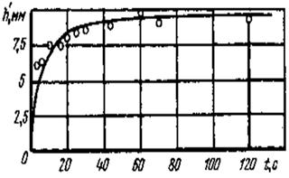 Рис. 15. Теоретическая и экспериментальная зависимости глубины каналов в кварцевом стекле от времени воздействия лазерного излучения в режиме автоканализации.