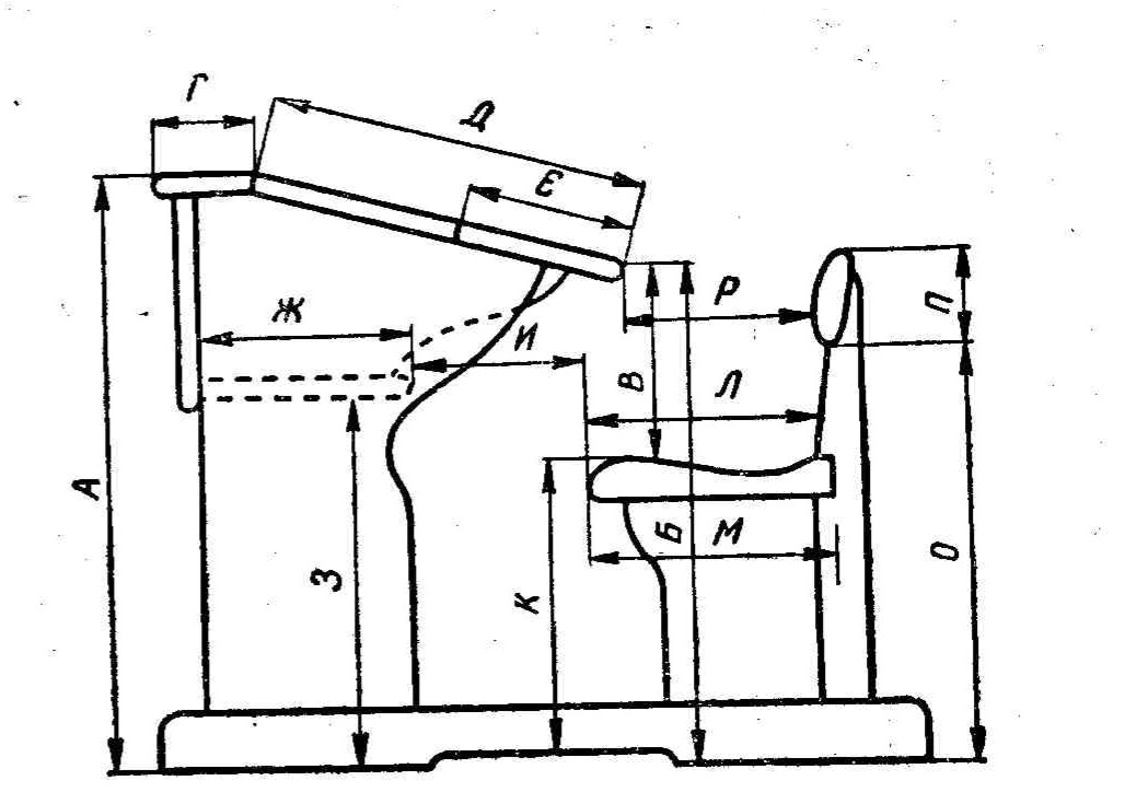 Рис. 32. Схема парты. Основные элементы парты: А —высота переднего края крышки над полом; Б — высота заднего края крышки над полом; В — разность высот заднего края крышки и сиденья; Г —ширина горизонтальной части крышки; Д — ширина наклонной части крышки (общая); Е — ширина откидной части крышки; Ж —ширина полочки; 3 — высота нижней поверхности полочки над полом; И — расстояние заднего края полочки от переднего края сиденья по вертикали; К — высота сиденья над полом; Л — глубина сиденья до стойки; М — глубина всего сиденья; О—-высота нижнего края спинного бруска над полом; П — высота спинного бруска; Р — дистанция спинки — расстояние наиболее выпуклой части спинного бруска от заднего края крышки (по вертикали)