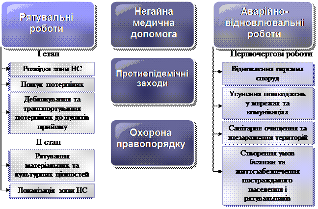 7.4 Ліквідація наслідків надзвичайних ситуацій Надзвичайні ситуації техногенного, екологічного, природного і військового характеру приводять до загибелі і поразки людей, руйнування будівель, виробничого устаткування, виникнення пожеж, затоплень, зараження атмосфери і місцевості. Люди можуть опинитися у завалах, у пошкоджених, підтоплених або палаючих будинках, інших непередбачуваних ситуаціях. У цих умовах головним завданням ЦЗ є проведення рятувальних та інших невідкладних робіт. Вони є складовою частиною робіт по ліквідації наслідків надзвичайних ситуацій. Їх проводять в першу чергу і в обмежені терміни.