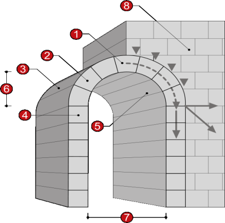 11 a) Match the parts of arch and words given: rise; abutment; keystone; back/extrados; clear span, "Bay"; voussoir; intrados; impost.