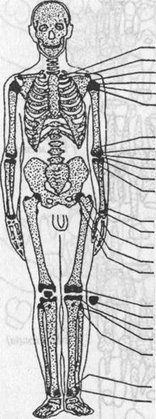 Череп людини: А — вигляд спереду; Б — вигляд збоку; В — вигляд з основи; / — лобова кістка; 2 — носова кістка; З — вилична кістка; 4 — верхньощелепна кістка; 5— нижня щелепа; 6— клиноподібна кістка; 7— тім'яна кістка; 8— скронева кістка; 9— соскоподібний відросток; 10— потилична кістка; //— великий (потиличний) отвір