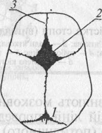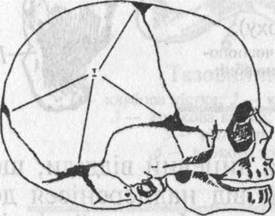 Череп новонародженої дитини (справа та зверху): / — заднє тім'ячко; 2 — передис тім'ячко; З — метопічиий шов У краніології прийняті такі латинські назви окремих частин черепа: сгапіит — череп із нижньою щелепою; саЬагіит — череп без нижньої щелепи; саіуагіа — мозковий череп без лицевої частини; саіуа — черепна кришка без основи черепа.