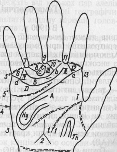 Папілярні узори на долоні: І ~~ ІЗ — умошіі поля долоні; Ну — ііпотсиар; 77/ — тсиар; І, П, НІ, IV — міжиальцеві подушечки; а, Ь, с, її— пальцеві трирадіуси; А, В. С, О — головні трирадіуси долоні; / — осьовий трирадіус долоні Для загальної оцінки розташування на долоні головних ліній застосовується індекс, запропонований американським антрополо-