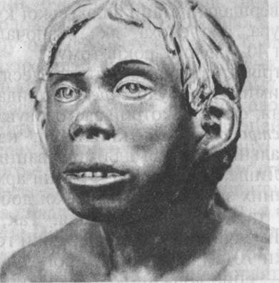 Людина з Араго (реконструкція Г. Лебединської) У 1971 р. французькі археологи, подружжя Анрі та Марі-Антуа-нетт Люмле віднайшли у печері Араго поблизу м. Тотавель у Східних Піренеях череп 20-річного чоловіка, який загинув приблизно 450 тис. років тому. Загалом у його зовнішності переважали архаїчні риси (сильний розвиток надбрівного рельєфу, випнуте вперед широке обличчя, довга вузька мозкова коробка та ін.), однак будова ендокрана свідчить про прогресивний розвиток мозку. Ще своєріднішим поєднанням архаїчних і "сапієнтних" рис характеризується потилична кістка 30-літньої людини з Вертешселле-ша поблизу Будапешта, що датується 350 років тому. Американський антрополог А. Тома з'ясував, що череп "вертешселлешця" назагал характеризувався архаїчними ознаками (товсті стінки, сильний розвиток рельєфу), однак мав цілком сучасний об'єм мозку — приблизно 1400 см3. Це ж стосується і черепа, знайденого в печері Петралона біля м. Салоніки. Визначаючись товстими стінками мозкової коробки, скошеним лобом з розвинутим надбрівним рельєфом, широким лицем і вигнутою потиличною кісткою, він разом із тим мав значну місткість — 1230 см3. Вік знахідки — близько 300 тис. років. Загалом усі без винятку різновиди архантропів (олдувайський та яванський пітекантропи, атлантропи, деякі ранні гомініди Європи, синантропи та ін.) належать до виду Ното егесїиз ("людина прямохо-дяча"), що мешкав на земній кулі приблизно 1,5— 0,3 млн років тому. Порівняно з Ното ИаЬіііз архантропи характеризувалися значно більшими розмірами тіла (середній зріст чоловіків — 160— 170 см) і об'ємом мозку (в середньому 1029 см3). Крім того, їм були властиві масивна будова черепа зі спадистим лобом, сильно розвинутим надочним та потиличним рельєфом; прогнатне, тобто випнуте вперед, обличчя із плоскими носовими кістками; важка нижня щелепа без підборідного виступу та великі зуби. З архантропами пов'язана ашельська археологічна культура, або ашельська епоха розвитку первісної культури, яка розпочалася приблизно 1,5 млн і завершилася близько 150 тис. років тому. На думку багатьох учених, цю епоху можна розділити на два великих періоди: давній, або ранній, ашель (1,5 млн — 400 тис. років тому) та пізній ашель (400— 150 тис. років тому). Визначальною рисою ашельської археологічної культури є поширення кам'яного рубила — масивного знаряддя мигдалеподібної форми з двобічною обробкою, яке виготовляли з кременю, кварциту тощо. Крім того, відомі також клівери — сокироподібні рубила з прямим чи вигнутим лезом, скребла, скребки, свердла тощо. Уже в ранньому ашелі першолюди розселилися в багатьох регіонах Старого Світу, включаючи Європу (до 50-ї паралелі). Хоча цей історичний період за часом збігається з гюнцьким та міндель-ським зледеніннями, клімат Євразії ще залишався відносно теплим. Походження людини Формування людини сучасного фізичного типу