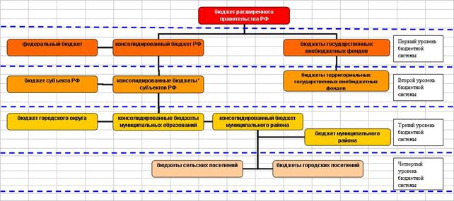 Совокупность бюджетов всех уровней (федеральный, субъектов РФ и местные бюджеты) и государственных внебюджетных фондов, основанная на экономических отношениях и государственном устройстве РФ образуют бюджетную систему РФ. Бюджетная система РФ является составной частью финансовой системы РФ и включает (рис.12): 1. первый уровень – федеральный бюджет и бюджеты государственных внебюджетных фондов; 2. второй уровень – бюджеты субъектов Российской Федерации. Всего их 89, в том числе: республиканские бюджеты – 21; краевые бюджеты – 8; областные бюджеты – 50, в том числе 1 бюджет автономной области; окружные бюджеты – 10; городские бюджеты Москвы и Санкт-Петербурга – 2; бюджеты территориальных государственных внебюджетных фондов; 3. третий уровень – местные бюджеты Федеральный бюджет и бюджеты государственных внебюджетных фондов разрабатываются и утверждаются в форме федеральных законов; бюджеты субъектов Российской Федерации и бюджеты территориальных государственных внебюджетных фондов – в форме законов субъектов Российской Федерации; местные бюджеты – в форме нормативных правовых актов представительных органов местного самоуправления либо в порядке, установленном уставами муниципальных образований.